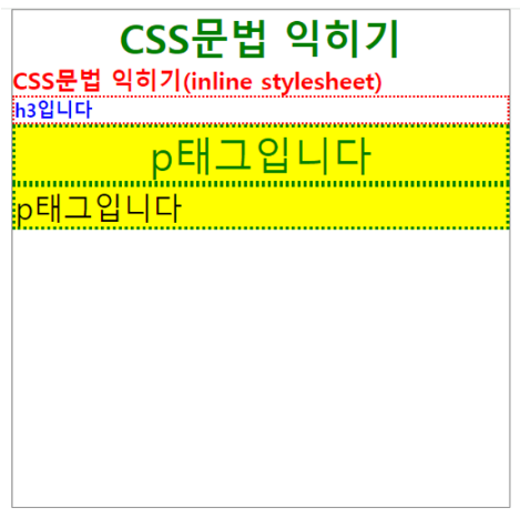 <h2 style="color:red">CSS๋ฌธ๋ฒ ์ตํ๊ธฐ(inline stylesheet)</h2>