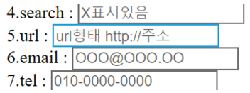 4.search : <input type="search" placeholder="Xํ์์์"><br>