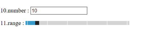 11.range : <input name="input9" type="range" max="100" value="10" step="10"><br>