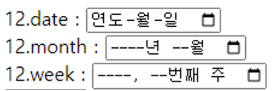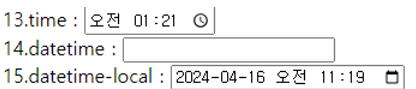 15.datetime-local : <input name="input15" type="datetime-local"><br>